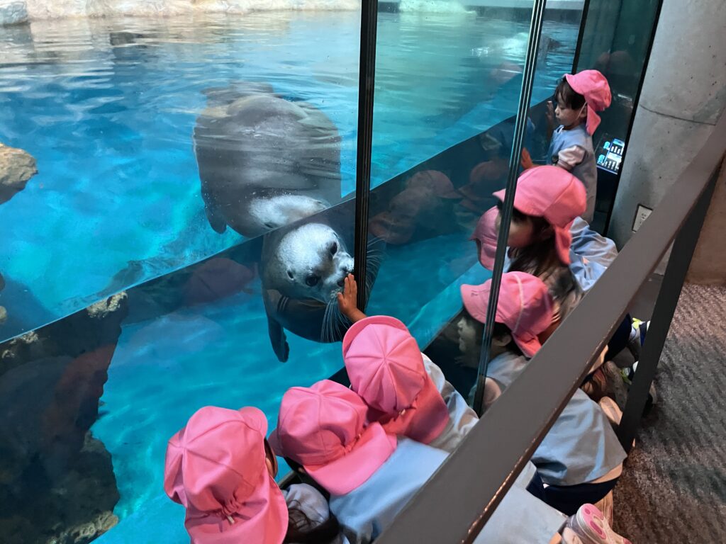 セイウチやペリカンのお稽古を真剣な表情で見る子供たち。上手に技ができると「おおー!すごい!」と、可愛らしい歓声が上がりました。大水槽では「サメサメ!」「エイ、大きい〜」「小さいお魚かわいい」と、たくさんの発見に大興奮の子供たちでした。